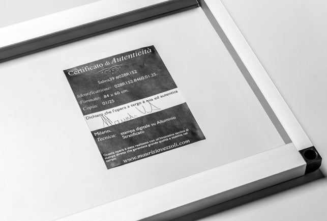 Le stampe dirette (a getto d'inchiostro) su alluminio stratificato (DiBond) sono accompagnate da un certificato di autenticità, firmato e numerato sul retro.